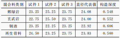 鋪砂法是測定路面的宏觀構(gòu)造深度的一種方法反映路面高速行車時(shí)的抗滑性。按照《公路工程瀝青及瀝青混合料試驗(yàn)規(guī)程》(JTGE20-2011)中鋪砂法的測試方法對輝綠巖、玄武巖、鋼渣和再生骨料等4種集料混合料車轍板進(jìn)行構(gòu)造深度測試,每組3塊試件。在對推鋪形成的圓面進(jìn)行鋼尺測量后,將測得的直徑按照規(guī)范推薦公式進(jìn)行計(jì)算,其測試結(jié)果如表1所示,其數(shù)據(jù)展示以及其與粗集料表面構(gòu)造排序的對比。