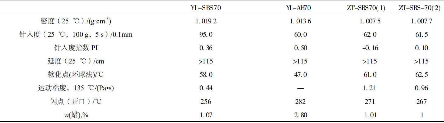YL-SBS70,YL-AH70,ZT-SBS70(1),ZT-SBS-70。4種瀝青原料性質如表1。